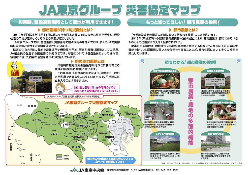 東日本大震災では、大きな被害が発生し、仮設住宅の用地が足りなくなるなどの事態が起こりました。JA東京グループでは、各自治体と災害協定を結ぶ取組みを進めており、多くのJAで災害時に自治体と協力する体制が確立されています。協定の主な内容は、農地を避難場所や仮設住宅用地、災害対策資材置場としての活用、JA組合員の生産する農産物の供給などです。内容については各自治体によって様々で、各地域に合った内容の協定を結ぶよう取組んでいます。