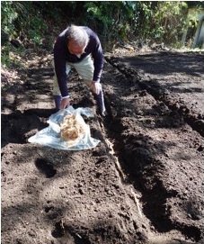 いまは、井之口さん(地下茎の発見と育種に関わり早稲田ミョウガをよみがえらせた練馬の農家、井之口喜實夫氏)に電話をして教えてもらいながらやっています。せっかくいただいた苗を無駄にしてはいけないので、失敗しないようにまずは、井之口さんがどう作ってきたのか、そのやり方を、できるだけそのままなぞる。うまくいくかどうかは別として、同じ条件でやってみないと、何が原因なのかも分からないですから。植え付けも、聞いた通りにやっています。芽は、二十㌢くらい下に入れて土を戻す。芽がある程度伸びてきたら土寄せをして敷き藁を敷く。自分なりの工夫をするのはもう少し先の話。まずは数年間教わった通りにやって三宅島の畑でどう出るのかを見る。その結果を引き受ける。いまはその段階にいるという感じです」