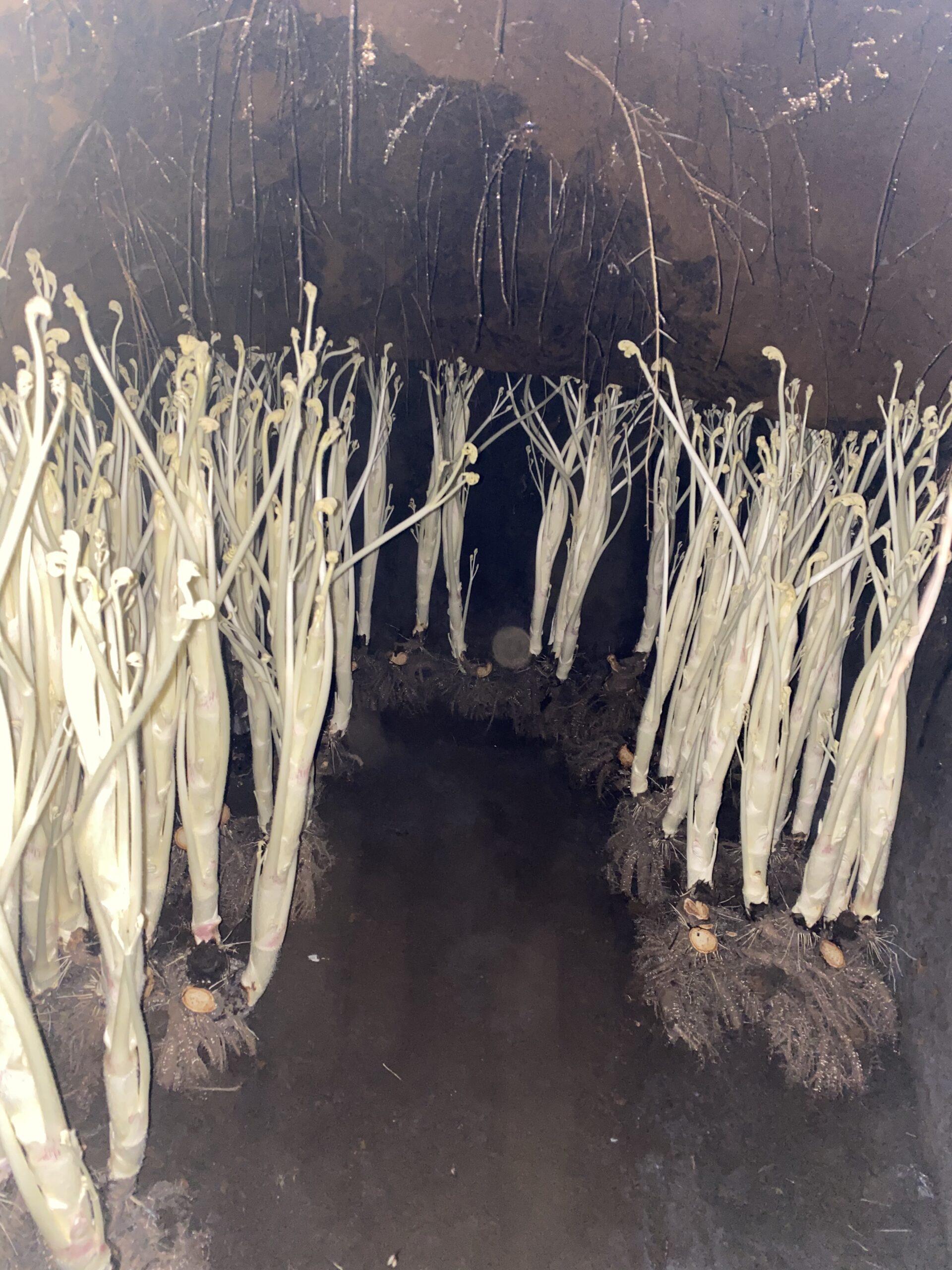 「初めて地下の穴に入ったときのことは衝撃的でよく覚えています。地上の畑とはまったく違う世界。暗くて狭くて土に囲まれている。その中で白いウドがずらっと並んでいるわけですが、まず、ここで作業するのかという驚きがありました。作業は単純に見えて、実際には体力も時間もものすごくかかります。穴に入ってウドを一本ずつ切り出し、根を処理して、地上に運び上げて箱詰めをする。そこで終わりではなく、そのまま築地市場へ出荷です。市場に持って行って、ようやく一日の仕事が終わる。帰ってくるのは夜遅くになってからで食事をして寝て、翌朝また同じ作業が始まる。